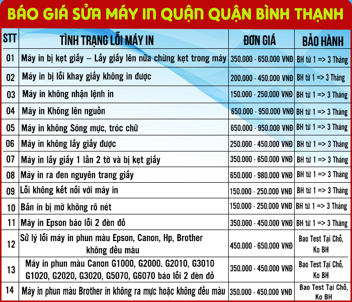 Bảng báo giá sửa máy in Quận Bình Thạnh tận nơi TPHCM