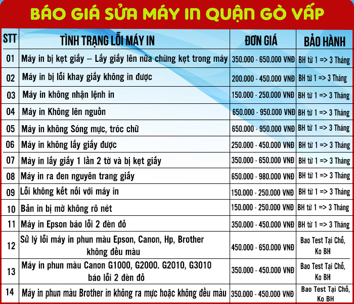 Bảng báo giá sửa máy in Quận Gò Vấp tận nơi TPHCM